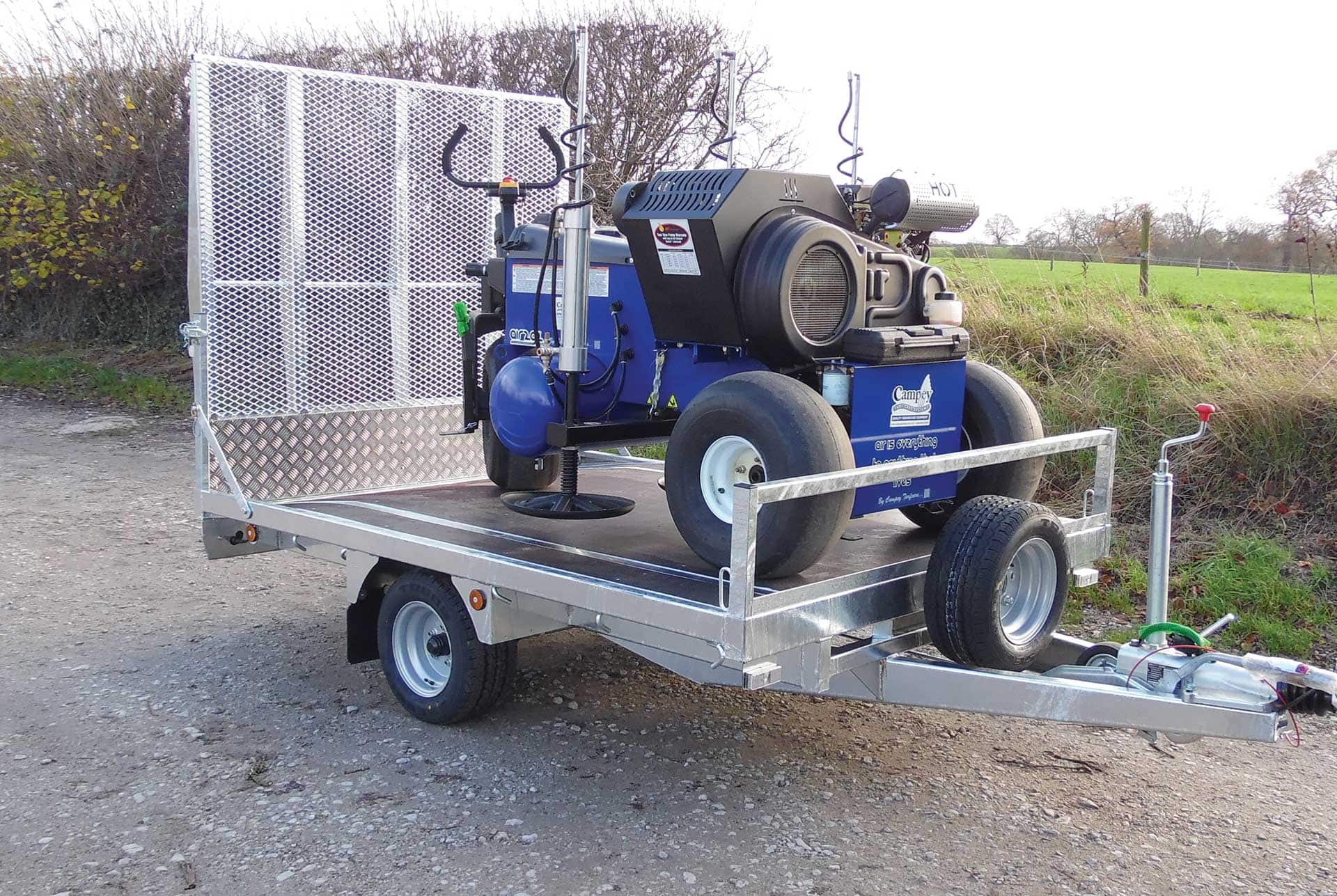 Specialist easy-load trailer for transporting machinery on roads and across turf areas. Designed to transport the Air 2G2, it will also accommodate other popular turf machinery like the Toro Procore, John Deere Aeracore, and small ride-on mowers. Fully roadworthy, with brakes & lighting, the tail-board ramp lowers to allow safe and easy loading, & the tie-downs supplied will secure machinery in place. Supplied with spare wheel.