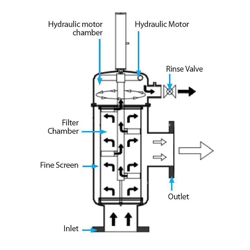 - Powered by source line water pressure, the filter’s backwashing system produces a concentrated high velocity and low volume reverse water flow to systematically clean the screen of any entrapped contaminants