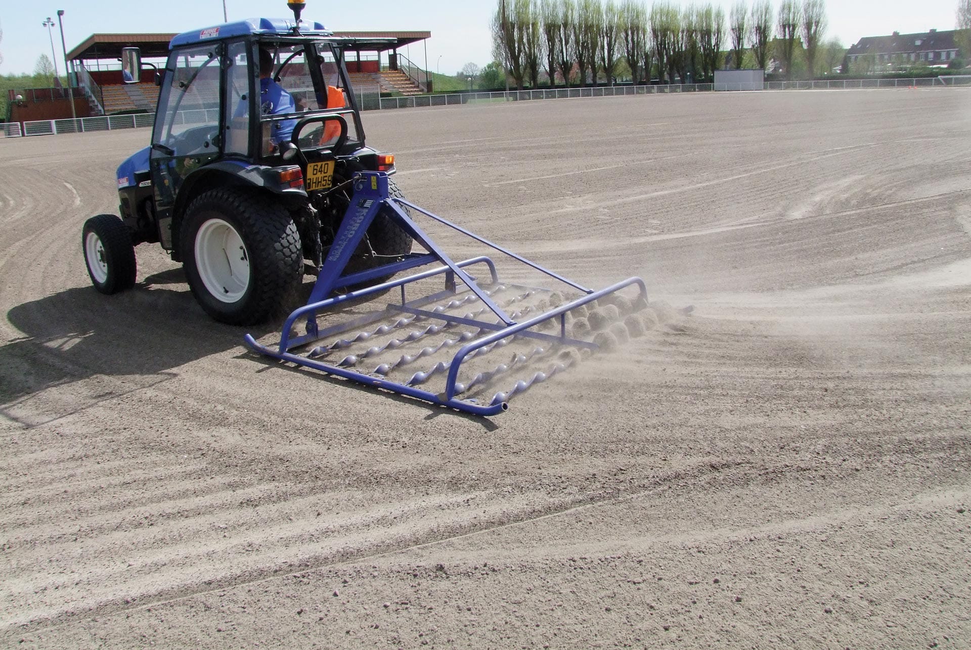 The Speed Harrow is designed for fast and efficient levelling of sports fields, after heavy top-dressing or after surface cultivation of Recycling Dresser. The specially designed fluted bars help to level the surface by allowing the dressing to flow through. The Speed Harrow 4100 is 3-point linkage mounted, and has hydraulic lift to the wing units. The Speed Harrow 2000 is a single rigid unit. The competition spec’ removable light levelling bars are suspended beneath the main frame for rubbing in light dressing on turfed surfaces, and for quickly restoring playing surface levels after matches.