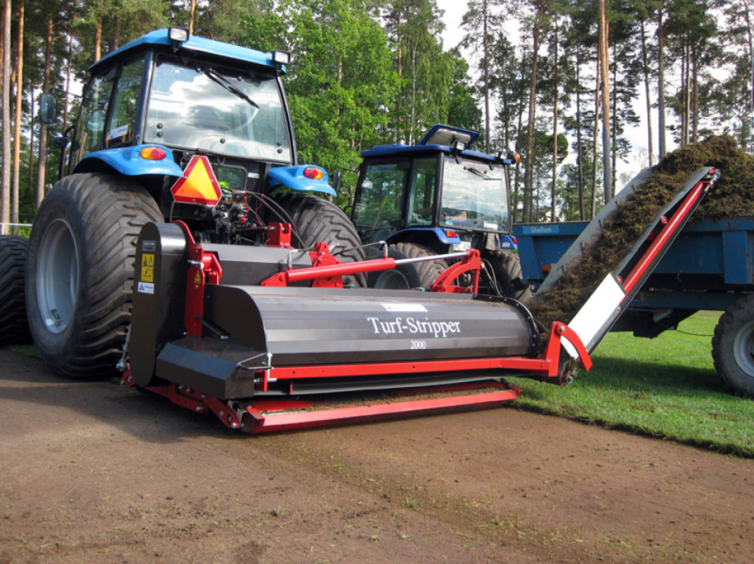 The Turf-Stripper 2000 fraise mower removes turf, weeds and thatch from sports fields quickly and accurately. A sidearm conveyor transfers the debris into a trailer. Optional hybrid rotors allow the Turf-Stripper to remove organic material from hybrid surfaces without damaging the synthetic fibers